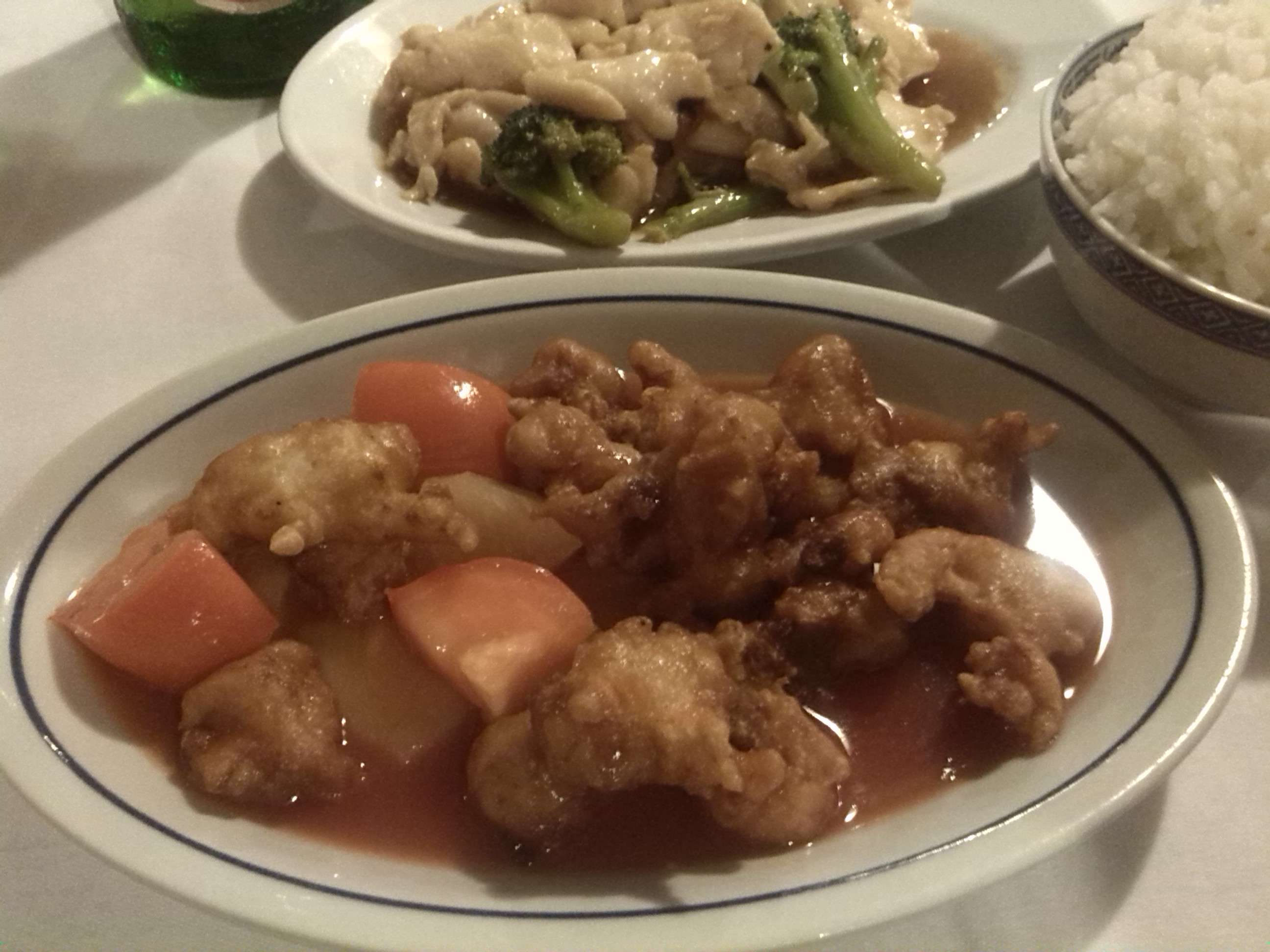 The main dishes came out when they were ready, similar to many Chinese restaurants in America. The sweet and sour pork was waiting on the edge of the table practically before the first dip of our classic ceramic soupspoons. A few tomato chunks graced the plate, rather than the bell pepper that I’m used to seeing. The chicken with broccoli was heavy on the chicken, which was very tender. The tastes were mild, inoffensive – no complaints, but not bursting with flavor. They were accompanied by a contorno (side dish) of white rice.