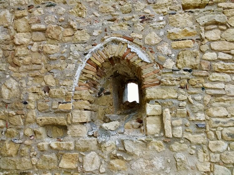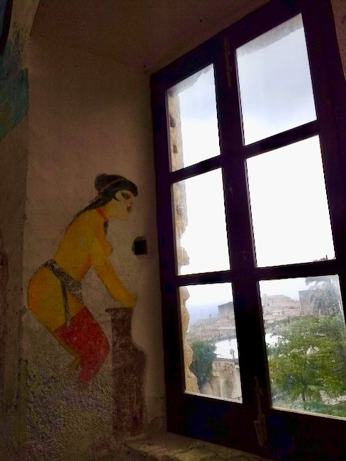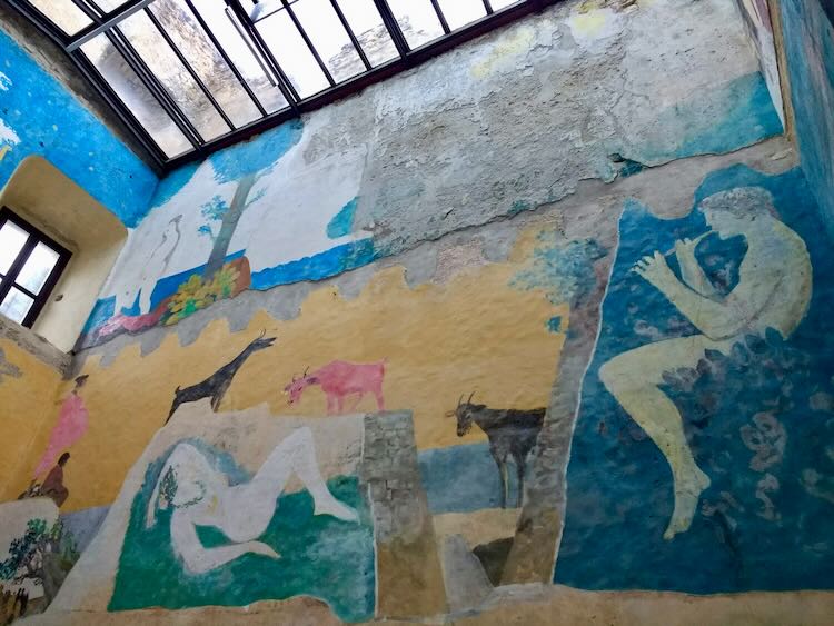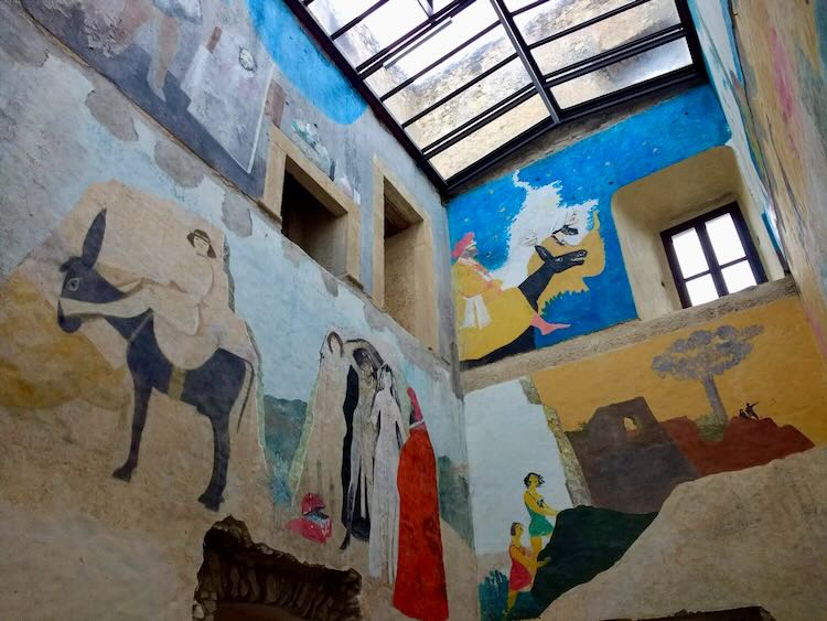 Back in the 70s, the room was roofless. In 1996 when Fiume returned to restore the frescos, a protective glass covering was added. The image subjects feature medieval life as well as the story of a beautiful Calabrian woman enslaved by Turks. Despite the roof, the frescos have continued to deteriorate.