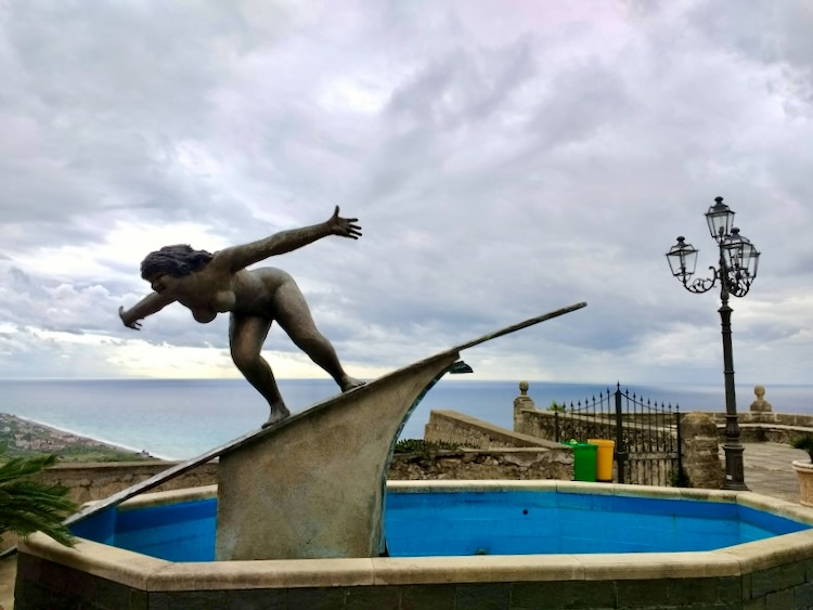 Not to be missed is Fiume’s bronze sculpture “La ragazza del surf” (1978). Or perhaps better said, you can’t miss the “Surfer Girl,” with her sturdy frame planted on an angled board, arms spread, hovering over a fountain, posed in the middle of the piazza with the sea behind. I imagine a few jaws must have dropped when the sculpture was placed in the village 45 years ago.